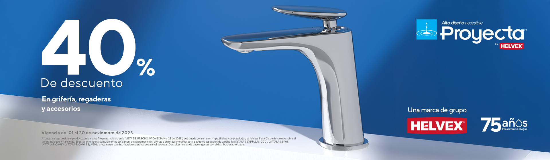 40% de descuento en todo Helvex y Proyecta, vigente del 1 al 30 de noviembre de 2025.