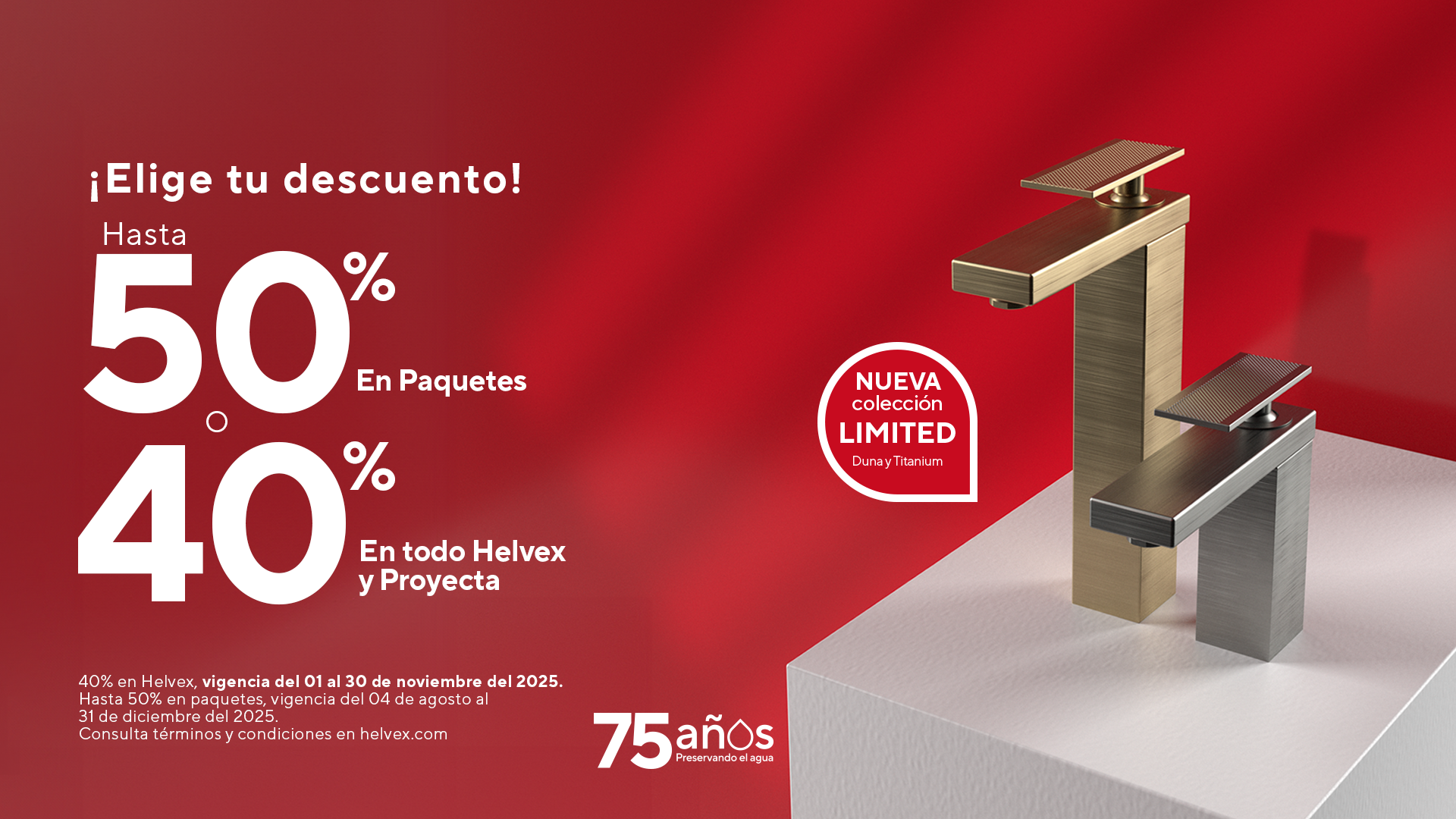 Del 1 al 30 de noviembre aprovecha 40% de descuento en todo Helvex y Proyecta ó hasta 50% de descuento en paquetes seleccionados. Eleva el diseño de tus proyectos con soluciones que combinan garantía y calidad.